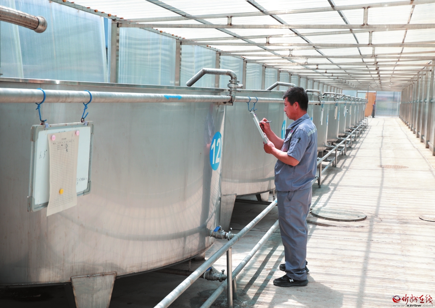 7月17日,五臺現(xiàn)代農(nóng)業(yè)產(chǎn)業(yè)示范區(qū)東雷片區(qū)產(chǎn)業(yè)園的福源食品有限公司曬棚里,工人正在記錄晾曬數(shù)據(jù)。該企業(yè)堅持采用當?shù)貎?yōu)質(zhì)的水源和原料,通過傳統(tǒng)古法釀造,生產(chǎn)無污染、無添加的產(chǎn)品,確保消費者吃到健康、營養(yǎng)的陳醋。(記者張存良攝)