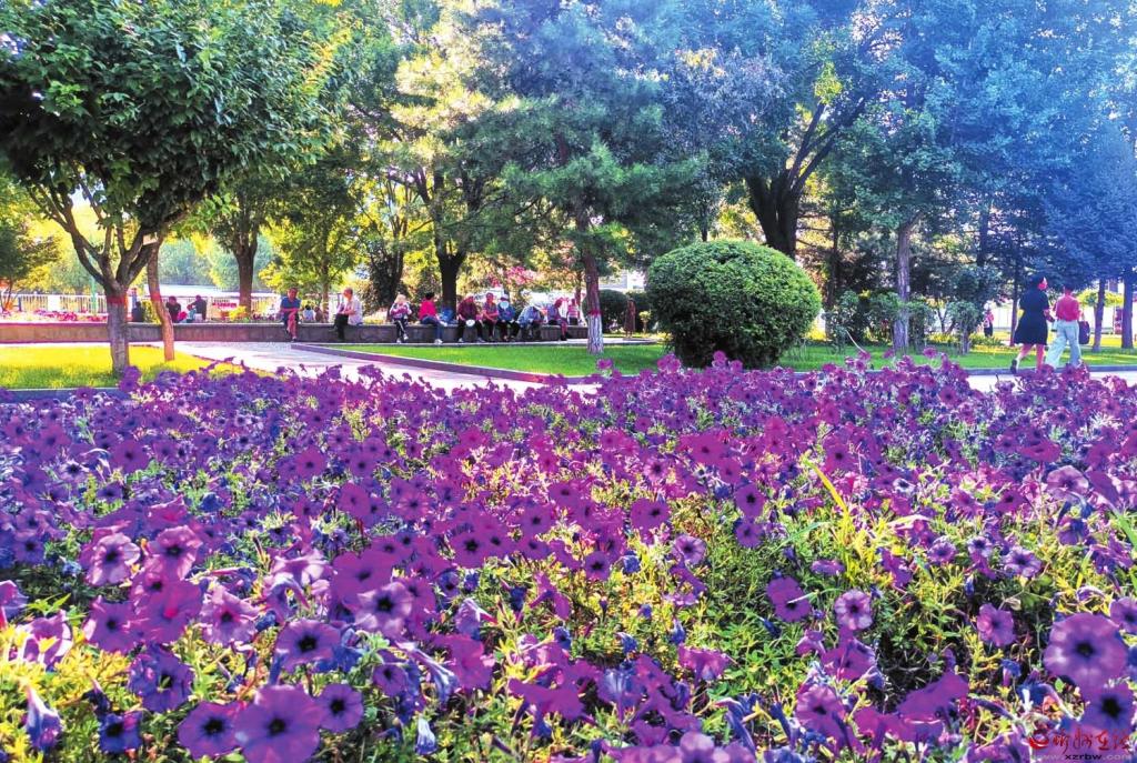 7月22日,市民在忻州城區(qū)體育廣場休閑納涼,享受清風(fēng)徐來、綠意盎然、花團錦簇的國家園林城市之美。(