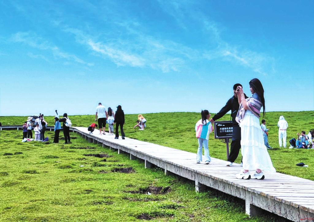 入伏以來,寧武蘆芽山旅游度假區(qū)的馬侖草原迎來眾多游客。藍(lán)天白云下,木質(zhì)棧道蜿蜒穿過翠綠草場,游客或漫步賞景、或拍照留念,沉浸在夏日草原的自然美景中。(吳光宇 劉強攝)