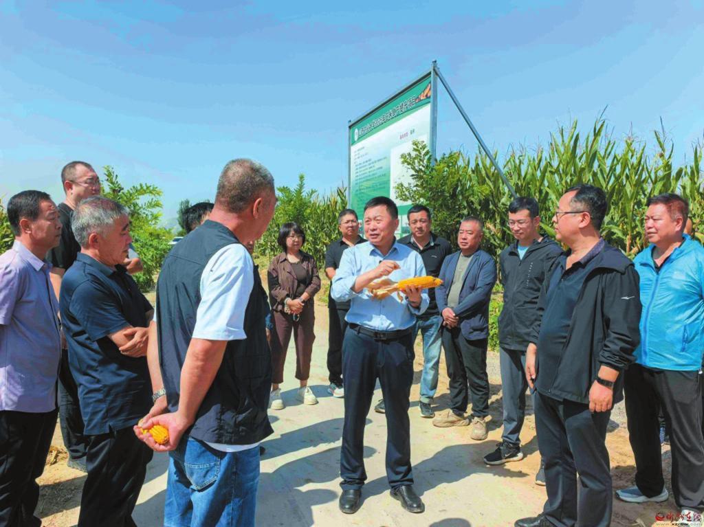 近日,定襄縣2024年玉米單產(chǎn)提升工程項(xiàng)目觀摩會(huì)成功舉辦。這場集成果展示、技術(shù)交流、經(jīng)驗(yàn)分享于一體的活動(dòng),讓種糧戶帶著理論知識走進(jìn)田間,在實(shí)踐中解碼玉米單產(chǎn)提升的“科技密碼”。圖為山西農(nóng)業(yè)大學(xué)玉米研究所負(fù)責(zé)人正在為參會(huì)者講解玉米單產(chǎn)提升工程的優(yōu)勢。(本報(bào)通訊員攝)