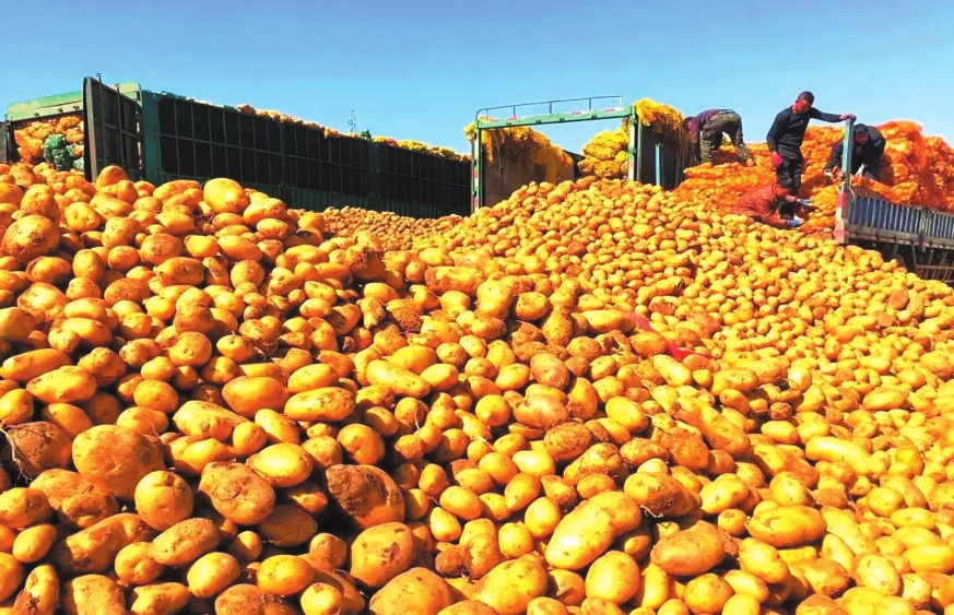 大田作物中,玉米貢獻(xiàn)了秋收“主色調(diào)”:玉米田穗大粒滿,金黃果穗綴滿秸稈,機(jī)械化收割設(shè)備穿梭田間。高粱與谷子在丘陵山區(qū)長勢喜人,紅透的高粱穗與沉甸甸的谷穗隨風(fēng)搖曳。土豆則以“地下黃金”之姿獲得豐產(chǎn),圓整塊莖從土壤中翻出,分揀后裝車外運(yùn)。
