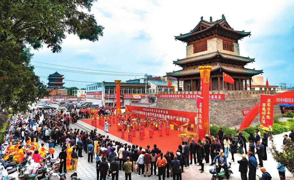 近日,“慶農業(yè)豐收,享美好生活——2025年中國農民豐收節(jié)代縣慶?;顒郁咿r產品展銷會”在代縣鐘樓廣場舉行。本次活動不僅呈現(xiàn)了豐富多彩的文藝節(jié)目,還設有彰顯本地特色的黃酒展區(qū)、非遺展區(qū),以及各鄉(xiāng)鎮(zhèn)特色農產品展區(qū),吸引了眾多游客。(王晉東攝)