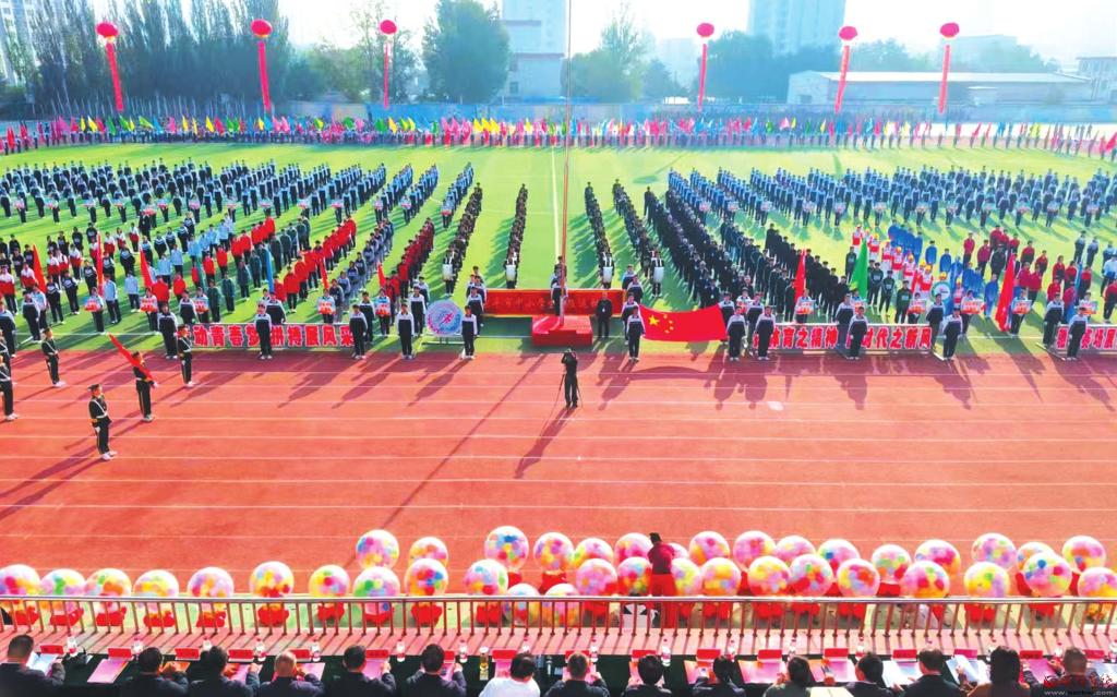 9月28日,原平市范亭中學(xué)校運動場上彩旗招展、鼓樂喧天,該市中小學(xué)秋季田徑運動會開幕,有小學(xué)、初中、高中的38支代表隊共3000余人參加了開幕式。圖為開幕式現(xiàn)場。(吉建平攝)