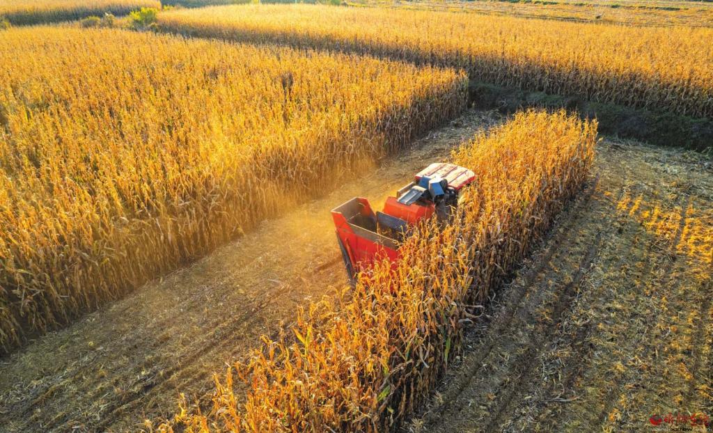 近日,原平市崞陽鎮(zhèn)下韓村村民正在緊張有序地?fù)屖沼衩?,確保秋糧顆粒歸倉。 (
