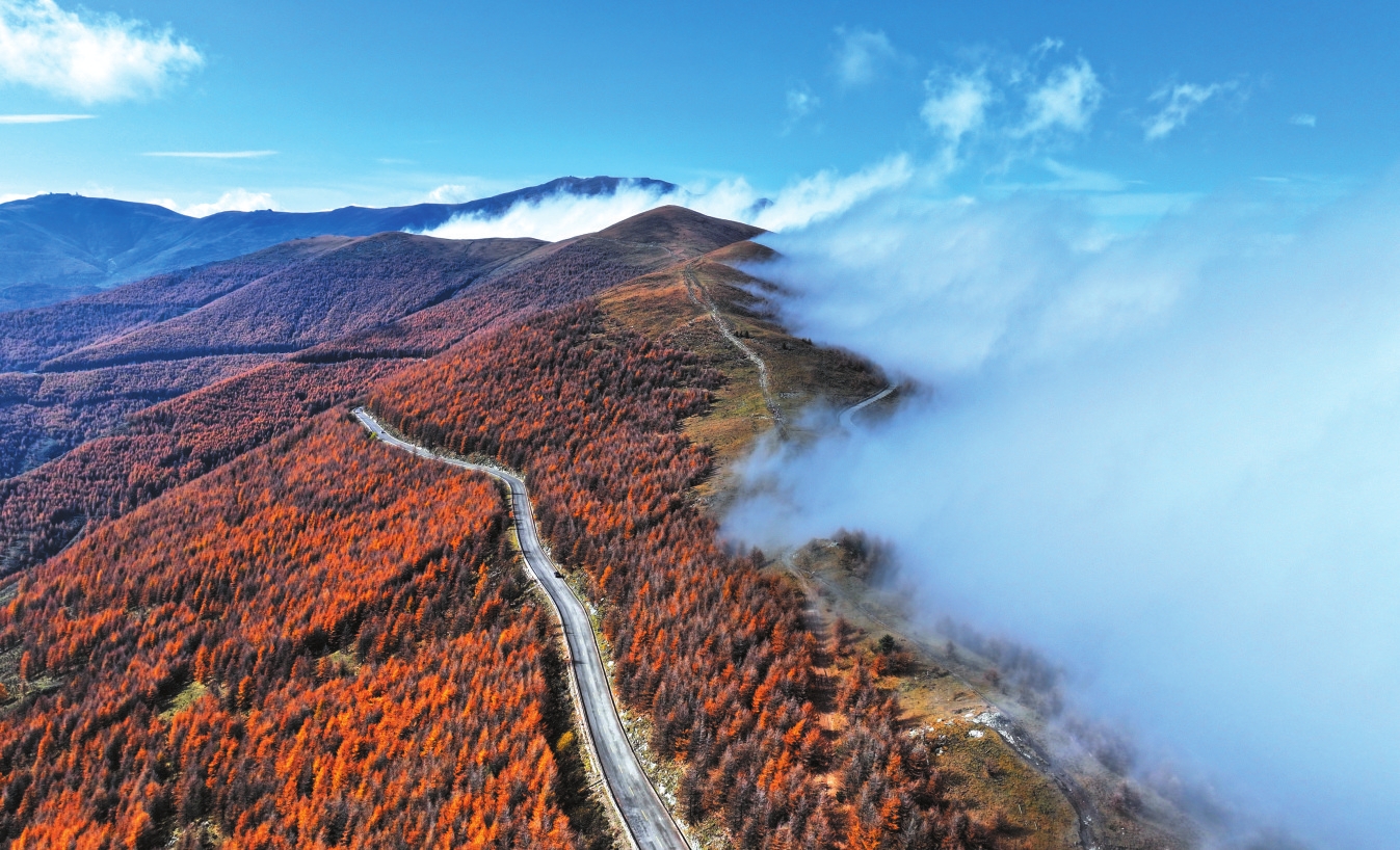 沿盤山路驅(qū)車而上,兩側(cè)的華北落葉松與云杉率先奏響秋之序曲。陽(yáng)光穿透枝葉,將針葉染成琥珀色;山風(fēng)過(guò)處,整片林海翻涌著金色波浪。腳下厚厚的落葉層踩上去沙沙作響,散發(fā)著松針與腐殖土混合的清香。在黛螺頂觀景臺(tái),常有云海自山谷間升騰,將五彩斑斕的山林切割成流動(dòng)的色塊,宛如印象派大師筆下的油畫。