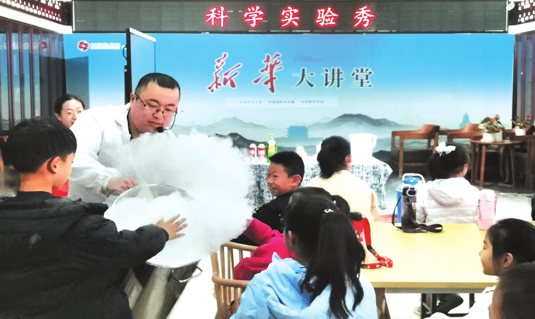 近日,在市圖書大廈“騰云駕霧”科學(xué)實(shí)驗(yàn)秀上,小朋友興奮地觸摸了“白云”。由市總工會、共青團(tuán)忻州市委主辦,忻州新華書店協(xié)辦,每周一次的“新華大講堂”深受小朋友歡迎。(本報(bào)記者宮清華攝)