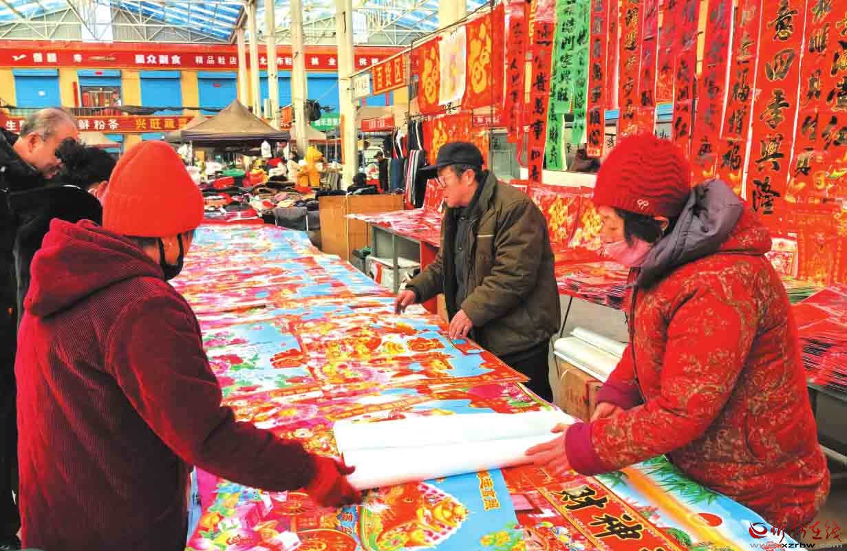 春節(jié)臨近,神池縣集貿市場迎來購銷兩旺的高峰期,處處洋溢著喜慶祥和的節(jié)日氛圍。圖為春聯(lián)年畫攤位前,市民正在精心挑選心儀的年貨。(