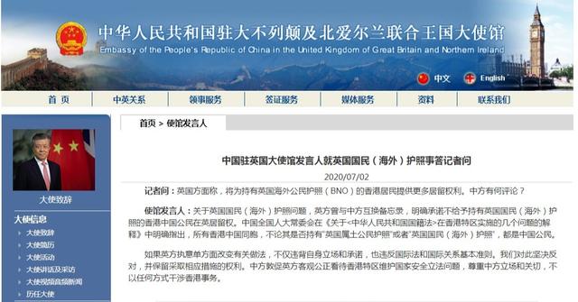 當(dāng)?shù)貢r(shí)間7月2日,中國(guó)駐英國(guó)大使館發(fā)言人就英國(guó)國(guó)民(海外)護(hù)照事答記者問時(shí)表示,關(guān)于英國(guó)國(guó)民(海外)護(hù)照問題,英方曾與中方互換備忘錄,明確承諾不給予持有英國(guó)國(guó)民(海外)護(hù)照的香港中國(guó)公民在英居留權(quán)。中國(guó)全國(guó)人大常委會(huì)在《關(guān)于〈中華人民共和國(guó)國(guó)籍法〉在香港特區(qū)實(shí)施的幾個(gè)問題的解釋》中明確指出,所有香港中國(guó)同胞,不論其是否持有“英國(guó)屬土公民護(hù)照”或者“英國(guó)國(guó)民(海外)護(hù)照”,都是中國(guó)公民。