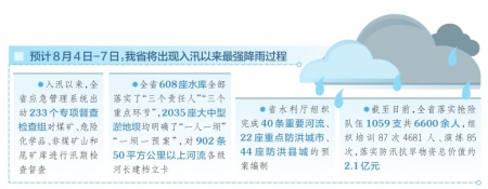 “我們將本著‘有汛無汛隨時準備、晴天雨天全員值守’的原則,強化隱患排查和處置力度,嚴陣以待,嚴防死守,以百分之一百的準備應(yīng)對百分之一的可能,確保全省安全度汛?!毖娬f。(張毅)