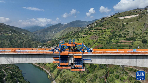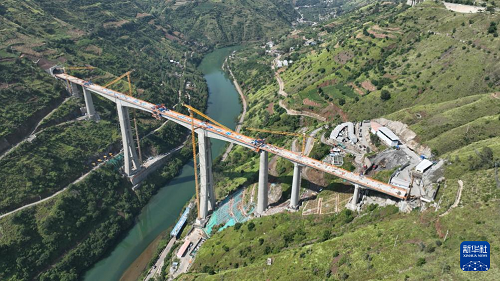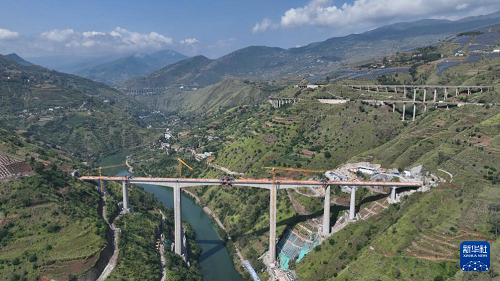 9月7日在云南省昭通市魯?shù)榭h江底鎮(zhèn)拍攝的渝昆高鐵江底牛欄江特大橋合龍現(xiàn)場(無人機(jī)照片)。(新華社發(fā) 張廣玉 攝)