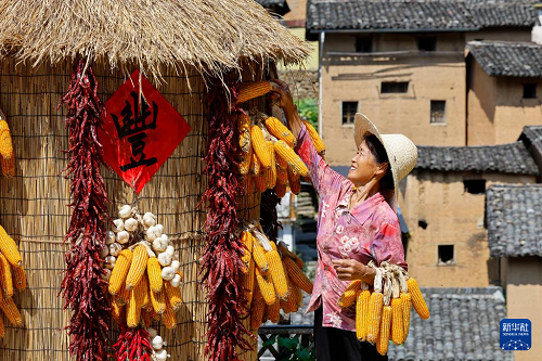 9月17日,安徽黃山歙縣陽產(chǎn)村村民在土樓前晾曬農(nóng)作物。(新華社發(fā) 樊成柱 攝)
