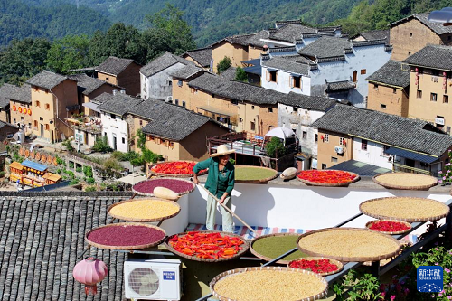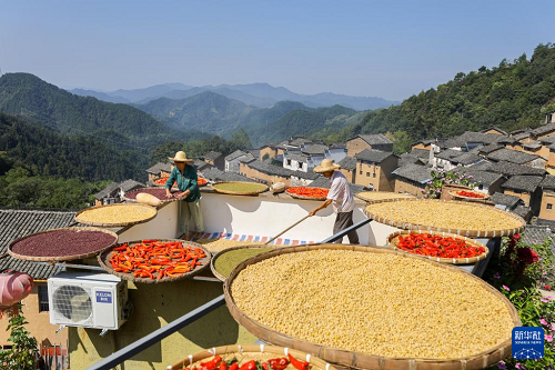 秋收時(shí)節(jié),在安徽省黃山市歙縣深渡鎮(zhèn)陽產(chǎn)村,村民利用晴好天氣,抓緊晾曬收獲的辣椒、玉米、山核桃等農(nóng)作物,描繪出一幅山村“曬秋”圖。