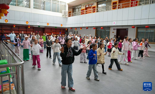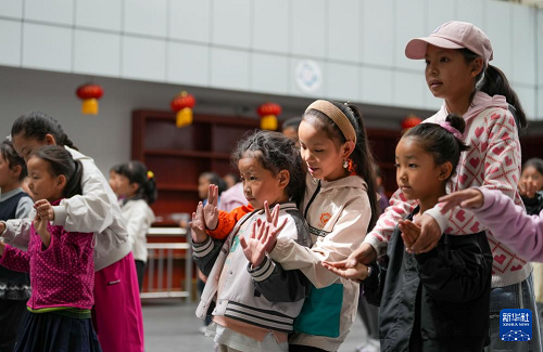 9月14日,在西藏自治區(qū)群藝館,學(xué)習(xí)藏戲的孩子們?cè)诨ハ嗉m正動(dòng)作。(新華社記者 晉美多吉 攝)