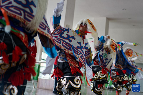 9月9日,在拉薩市第二中等職業(yè)技術(shù)學(xué)校,學(xué)生們?cè)诰毩?xí)藏戲。(新華社記者 張笑宇 攝)