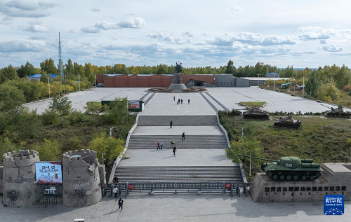 9月18日,人們在內(nèi)蒙古呼倫貝爾市海拉爾區(qū)世界反法西斯戰(zhàn)爭海拉爾紀念園參觀(無人機照片)。(新華社記者 貝赫 攝)