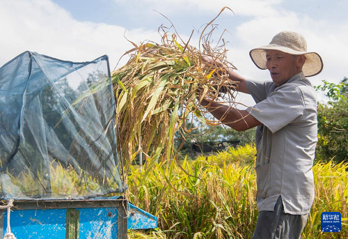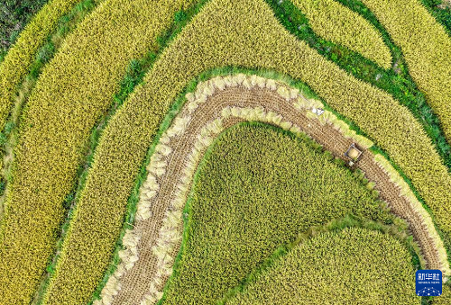 地處武陵山區(qū)腹地的重慶市黔江區(qū)五里鎮(zhèn)水稻種植面積5300畝,是武陵山地區(qū)糧食主要產(chǎn)區(qū)之一。秋收時(shí)節(jié),金黃色的水稻鋪滿山坡,稻農(nóng)們利用晴好天氣搶收稻谷,呈現(xiàn)出一派美麗的豐收畫(huà)卷。