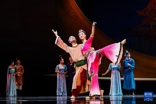 9月20日晚,演員在敦煌大劇院表演新版《絲路花雨》。(新華社記者 郎兵兵 攝)