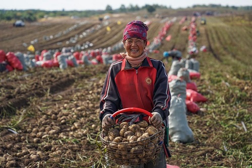 9月22日,河北省承德市圍場滿族蒙古族自治縣御道口鎮(zhèn)農(nóng)民在田間展示收獲的馬鈴薯。(新華社發(fā) 劉滿倉 攝)