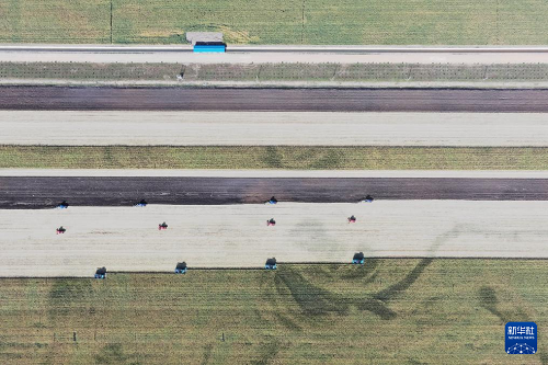 9月23日,在黑龍江北大荒農業(yè)股份有限公司友誼分公司一旱田地塊,大型農業(yè)機械在進行大豆收獲作業(yè)(無人機照片)。(新華社記者 王松 攝)