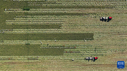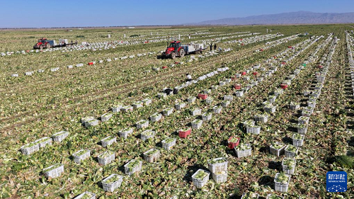 9月23日,菜農(nóng)在甘肅山丹馬場(chǎng)蔬菜基地里收獲蔬菜(無人機(jī)照片)。(新華社發(fā) 王超 攝)
