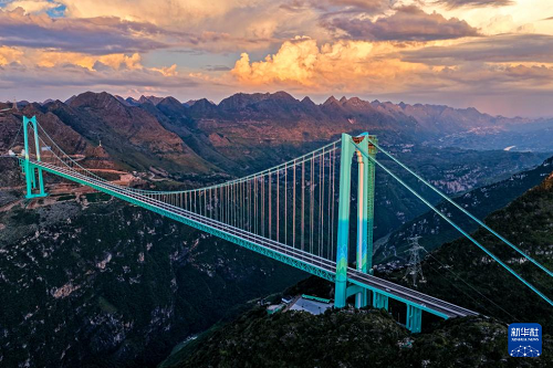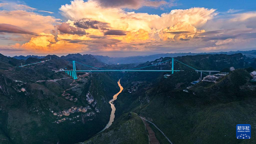 花江峽谷大橋是貴州六枝至安龍高速公路的控制性工程,大橋全長(zhǎng)2890米,主跨1420米,是目前世界山區(qū)峽谷第一大跨度鋼桁梁懸索橋;其橋面距水面垂直高度625米,超越北盤江第一橋成為新的世界第一高橋,被譽(yù)為“橫豎都是第一”。在不同時(shí)段的光線下,世界第一高橋呈現(xiàn)出不同的美景。