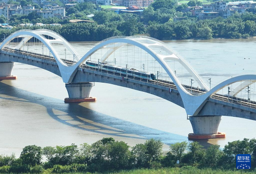9月29日,列車駛?cè)霝I海快線帝封江站(無(wú)人機(jī)照片)。(新華社記者 林善傳 攝)