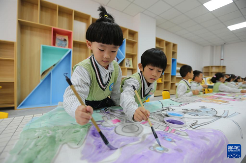 9月28日,甘肅省定西市安定區(qū)幼兒園的小朋友在繪制《我愛你中國》長(zhǎng)卷。(新華社發(fā) 王克賢 攝)