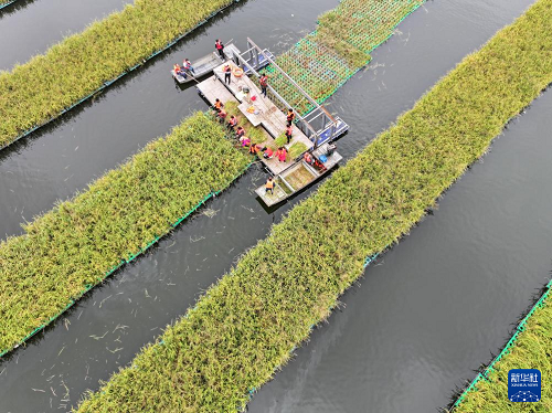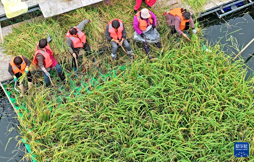 10月14日,工人在淮南市鳳臺縣顧橋鎮(zhèn)采煤沉陷區(qū)水面上收獲漂浮式水稻(無人機照片)。(新華社發(fā) 陳彬 攝)