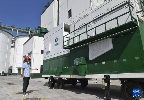 10月15日,在中儲(chǔ)糧成都青白江倉(cāng)儲(chǔ)有限責(zé)任公司,技術(shù)人員介紹移動(dòng)式組合清理設(shè)備。(新華社記者 劉坤 攝)