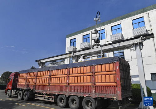 10月15日,在中儲(chǔ)糧成都青白江倉(cāng)儲(chǔ)有限責(zé)任公司,智能扦檢平臺(tái)在對(duì)剛運(yùn)來的糧食進(jìn)行隨機(jī)扦取樣品操作。(新華社記者 劉坤 攝)