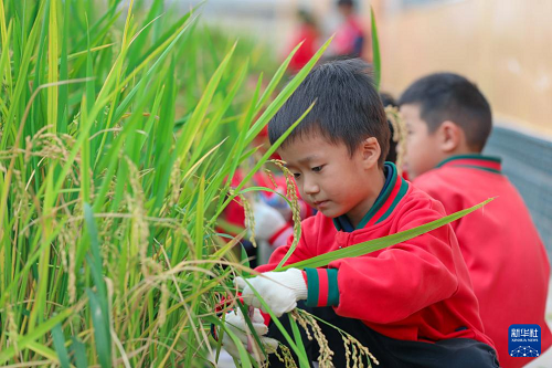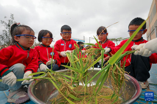 10月15日,云南省曲靖市陸良縣大莫古鎮(zhèn)中心幼兒園的孩子們在校內(nèi)勞動基地體驗(yàn)收稻谷。(新華社發(fā) 王勇 攝)