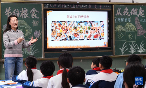 10月15日,河南省商丘市夏邑縣育才學(xué)校老師在世界糧食日主題班會上講解糧食知識。(新華社發(fā) 苗育才 攝)