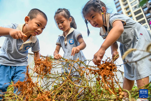10月15日,在湖南省永州市道縣城東幼兒園,小朋友在體驗(yàn)采收花生。(新華社發(fā) 蔣克青 攝)
