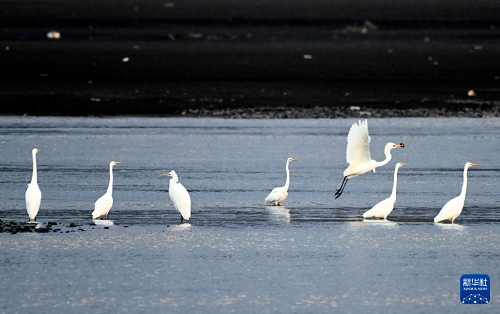 11月3日,在黑龍江省牡丹江市江心島附近的江灘淺流中,白鷺在覓食。(新華社發(fā) 張春祥 攝)
