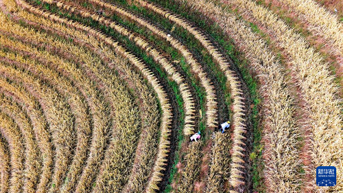 11月5日,龍脊鎮(zhèn)大寨村村民在梯田上收割水稻(無人機照片)。(新華社發(fā) 潘志祥 攝)