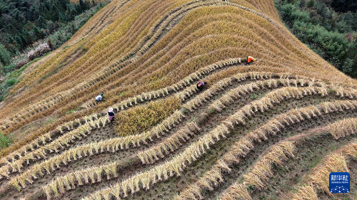 日前,廣西桂林市龍勝各族自治縣龍脊鎮(zhèn)大寨村種植的水稻進入收獲季節(jié),梯田之上呈現(xiàn)出一派忙碌的景象。