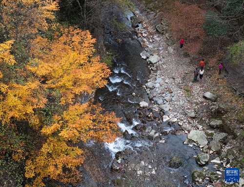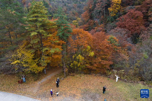 11月5日,游人在位于漢中市南鄭區(qū)的黎坪國家森林公園內(nèi)拍照游玩(無人機照片)。(新華社記者 邵瑞 攝)