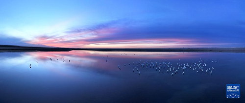 在甘肅省酒泉市阿克塞哈薩克族自治縣,白鷺在冬不拉水庫(kù)棲息覓食(無(wú)人機(jī)照片,11月9日攝)。(新華社發(fā) 高宏善 攝)