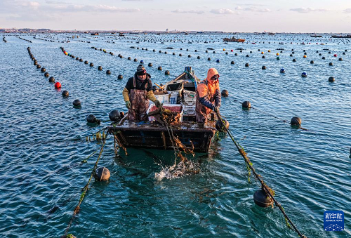 眼下,山東省榮成市海帶播苗作業(yè)全面展開,養(yǎng)殖工人們抓緊時間進行夾苗、播苗等作業(yè)。