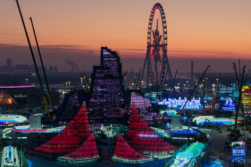 這是12月10日拍攝的哈爾濱冰雪大世界主塔施工現(xiàn)場(無人機照片)。(新華社記者 張濤 攝)
