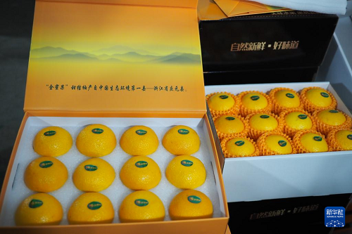 這是12月11日在浙江省慶元縣竹口鎮(zhèn)黃壇水干果園區(qū)內(nèi)拍攝的分裝好的甜桔柚禮盒。(新華社記者 劉梓漪 攝)
