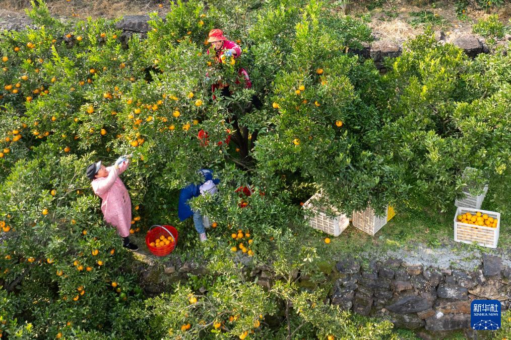 12月11日,在湖北省宜昌市長(zhǎng)陽(yáng)土家族自治縣漁峽口鎮(zhèn)巖松坪村,村民在采摘清江椪柑(無(wú)人機(jī)照片)。(新華社記者 杜子璇 攝)