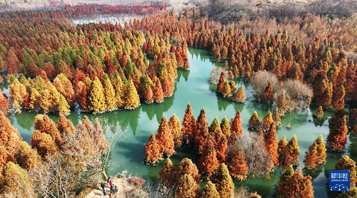 12月14日在昆明市盤龍區(qū)滇源街道甸尾村拍攝的水杉濕地景色(無人機照片)。(新華社發(fā) 梁志強 攝)