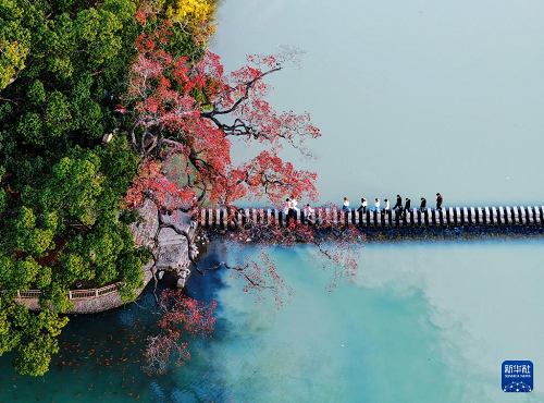 12月9日,在浙江省嘉興市西南湖生態(tài)公園,游客與水杉的倒影相映成景(照片翻轉(zhuǎn)180度)。(新華社發(fā) 金鵬 攝)