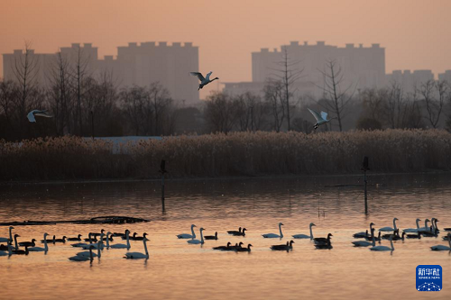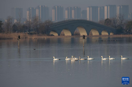 進(jìn)入冬季,成群的候鳥(niǎo)飛抵安徽省滁州市明湖公園,在此休憩、覓食。明湖公園是一座融合自然景觀與人文景觀的城市公園,優(yōu)良的水質(zhì)、豐茂的水草和豐富的魚(yú)蝦資源,使這里逐漸成為天鵝等越冬候鳥(niǎo)和各種鳥(niǎo)類的棲息地。