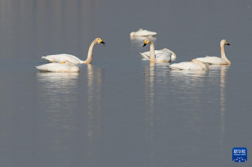 12月16日,天鵝等候鳥(niǎo)在安徽省滁州市明湖公園休憩。(新華社記者 張端 攝)
