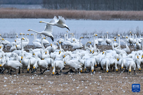 這是12月20日在河南省三門峽市黃河濕地拍攝的白天鵝。(新華社發(fā) 李恒 攝)
