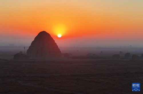 寒冬時節(jié),晨曦中的西夏陵與繽紛霞光及峰巒疊嶂的賀蘭山共同形成雄偉壯麗的景觀。