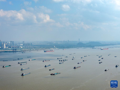 12月29日在長(zhǎng)江江蘇南通段江面上拍攝的的眾多貨船(無人機(jī)照片)。(新華社發(fā) 許叢軍 攝)