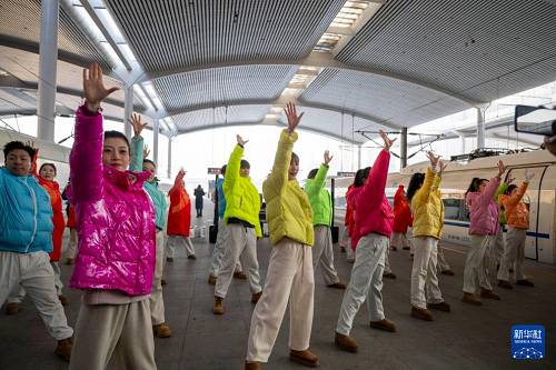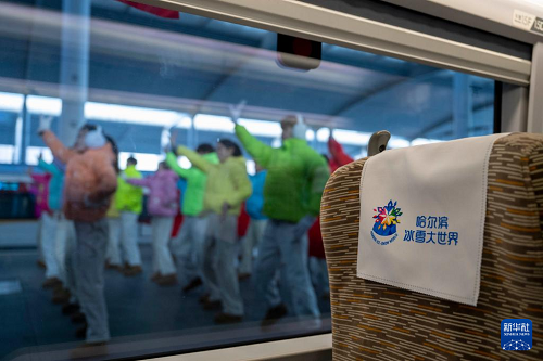 1月4日,演職人員在“哈爾濱冰雪大世界”主題高鐵列車G1276外表演。(新華社記者 張濤 攝)